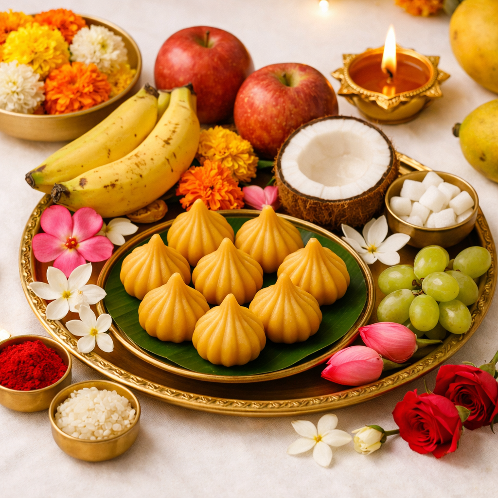 Offer flowers, modak, and fruits.